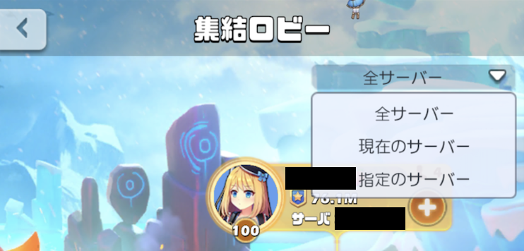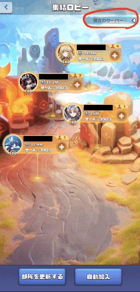 右上で現在のサーバーを選択した場合は現在のサーバーでの募集チームが見れる他、『指定のサーバー』を選択後に特定のサーバー番号を指定することで他のサーバーで募集しているチームに混ざることもできます。
