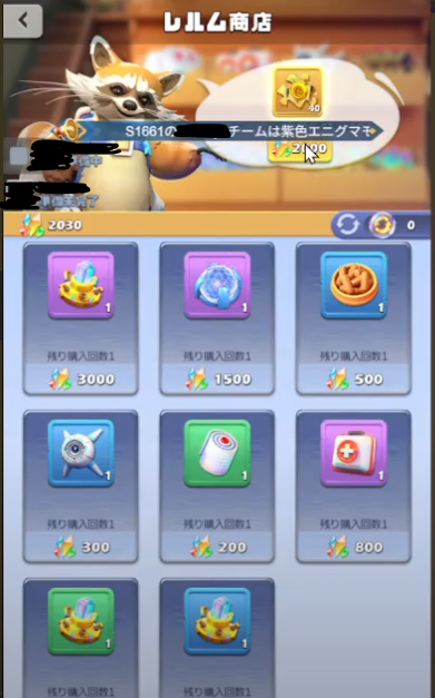チームによりますが、中央のボスでランキングを狙う場合には捕獲中に使うと好感度を上げられるビーガンソーセージ(右上の500水晶のアイテム)を、SRエニグマを大量ゲットするにはSRエニグマを確定で召喚できる強エニグマルアー(左上の3000水晶のアイテム)を購入していくことになるかと思います。