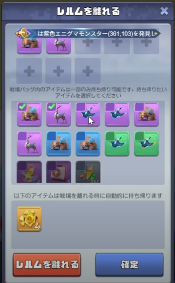 その際に持ち帰るエニグマの選択を行うので、必ず間違えないように選択して右下の確定ボタンを押しましょう。