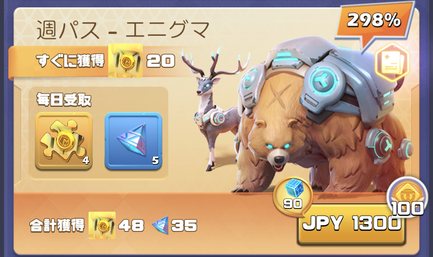 週パスのレベルが1の場合、1300円でSSRの欠片は単価約27円で、40個で1083円相当が毎週手に入ると考えるとなかなか大きいのではないでしょうか。(週パスLv.7でも867円相当です)