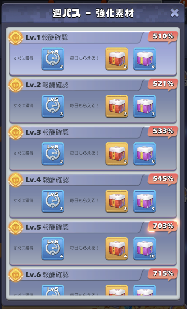 特に週パスを購入すると週パスレベルが上がり、週パスレベルがLv.5になると、最初に高速放火Lv.5が4こついてきたりして得になっていきます。