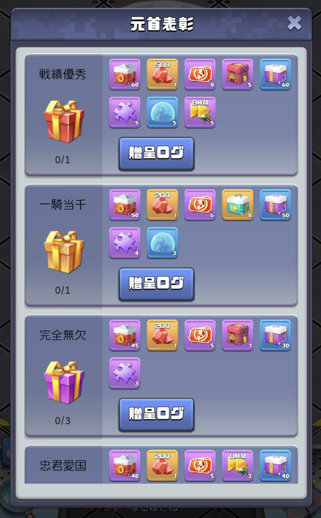 実は元首表彰でも『Lv.3強化部品宝箱』が結構もらえます。