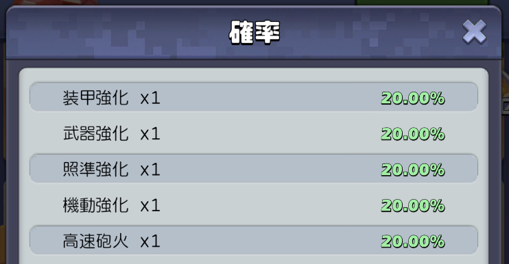 また、通常の(新ではない方の)強化部品宝箱では高速放火が出る確率は20%です。