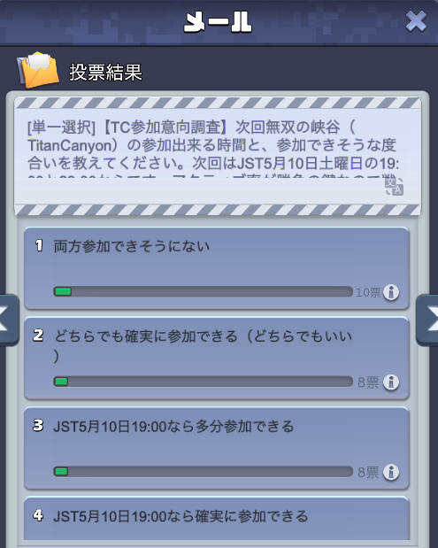 無双の峡谷がある週に、ゲーム内の投票機能およびdiscord上の投票を用いて、72時間以内で出欠確認を取ります。