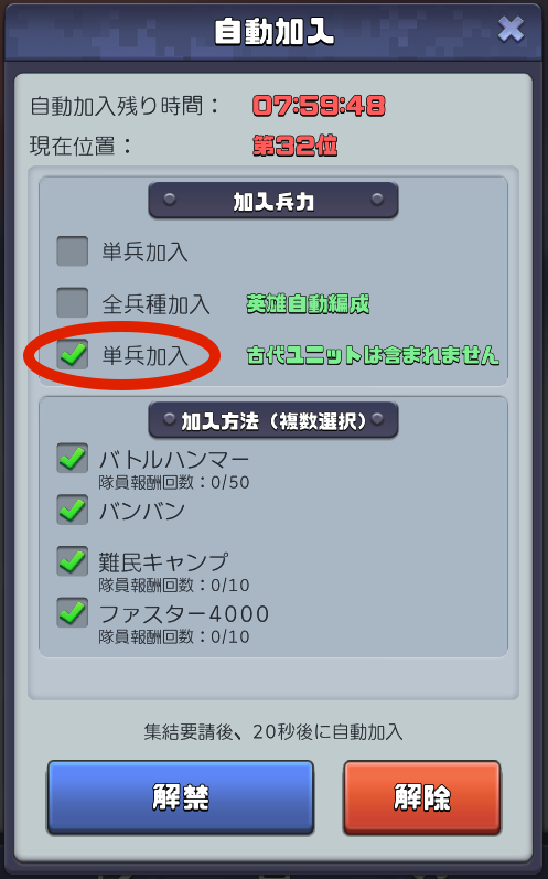 自動加入設定をする場合、『単兵加入』をして下さい。