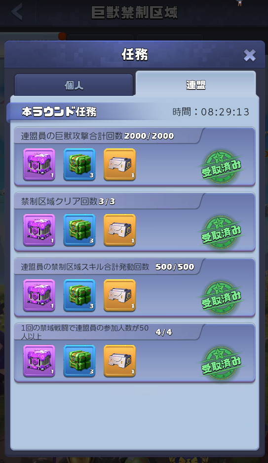 巨獣禁制区域はレベルによりますが全てのステージをクリアでき、連盟任務は毎回全て回収しています。