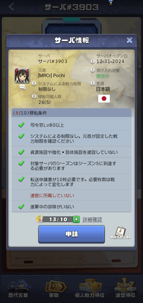 サーバー移転時には連盟を抜ける必要がありますが、先に申請をして承認をもらっておくことは可能です。